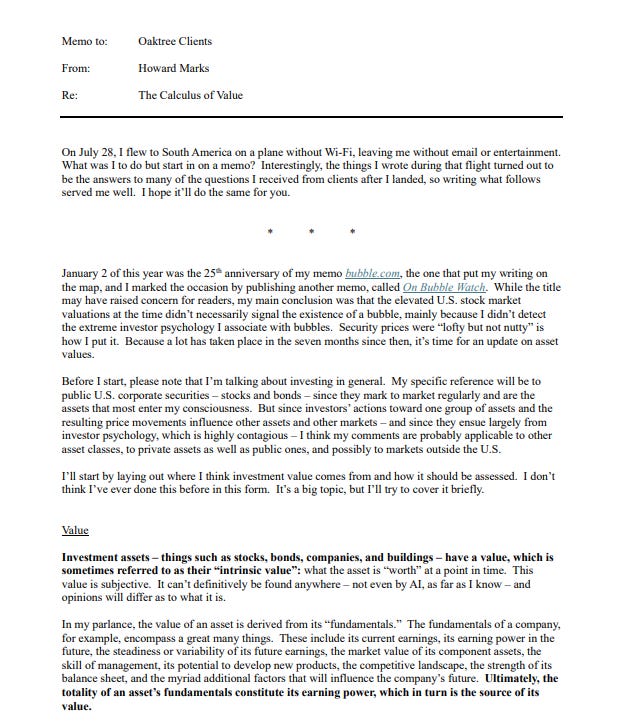 In this week’s issue, I’m sharing my highlights and takeaways from Howard Mark’s letter, The Calculus of Value