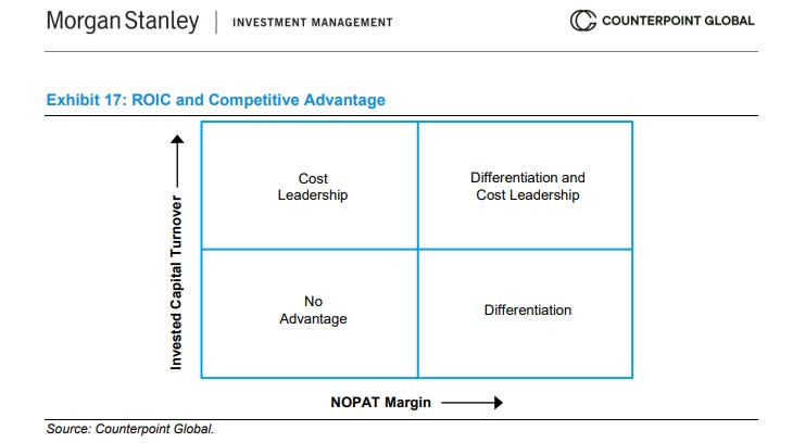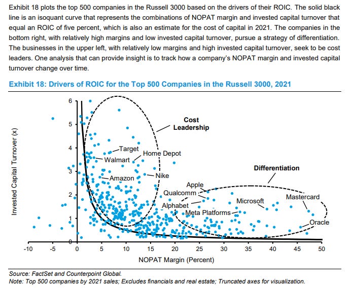 The companies in the bottom right, with relatively high margins and low invested capital turnover, pursue a strategy of differentiation. (Think Microsoft, Oracle, Meta, Mastercard, and Google)