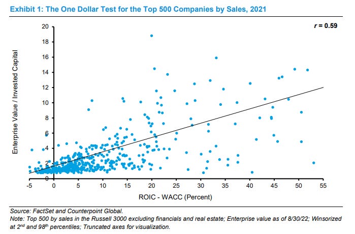 A company creates value when one dollar invested in the business is worth more than one dollar in the market.